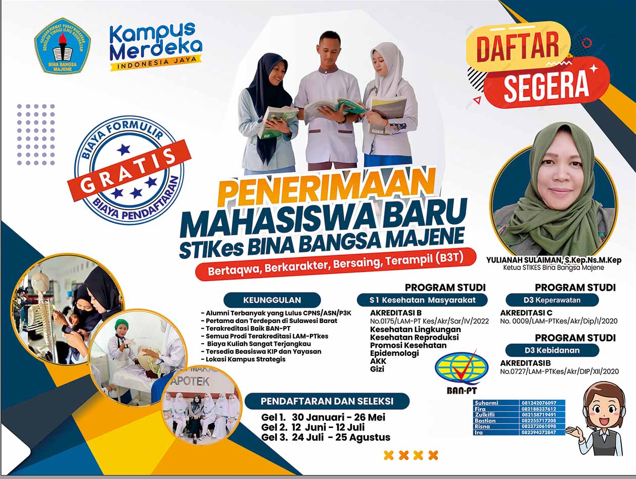 Pendaftaran Mahasiswa Baru Sekolah Tinggi Ilmu Kesehatan Bina Bangsa MajeneGelombang I :